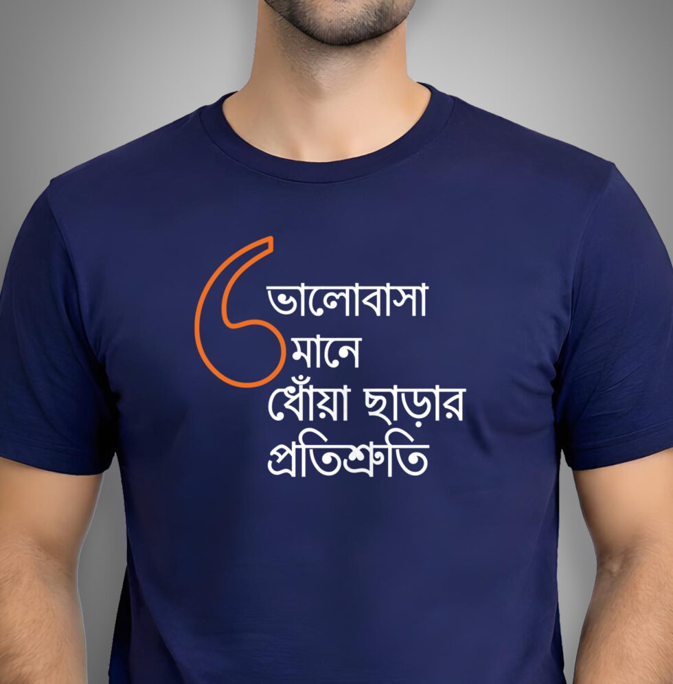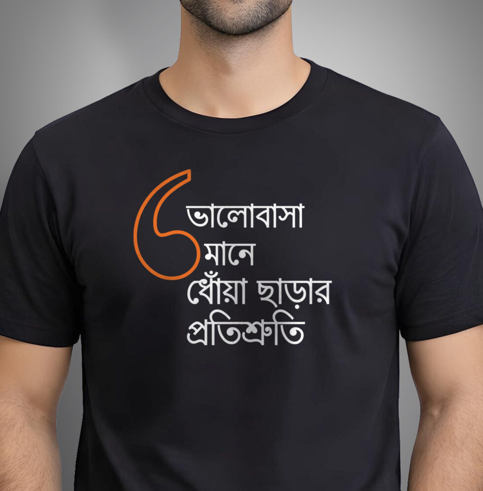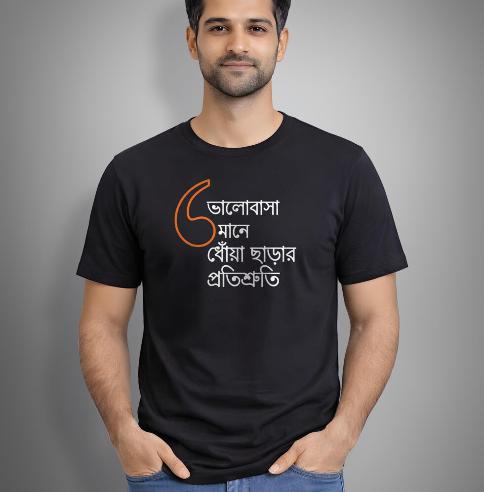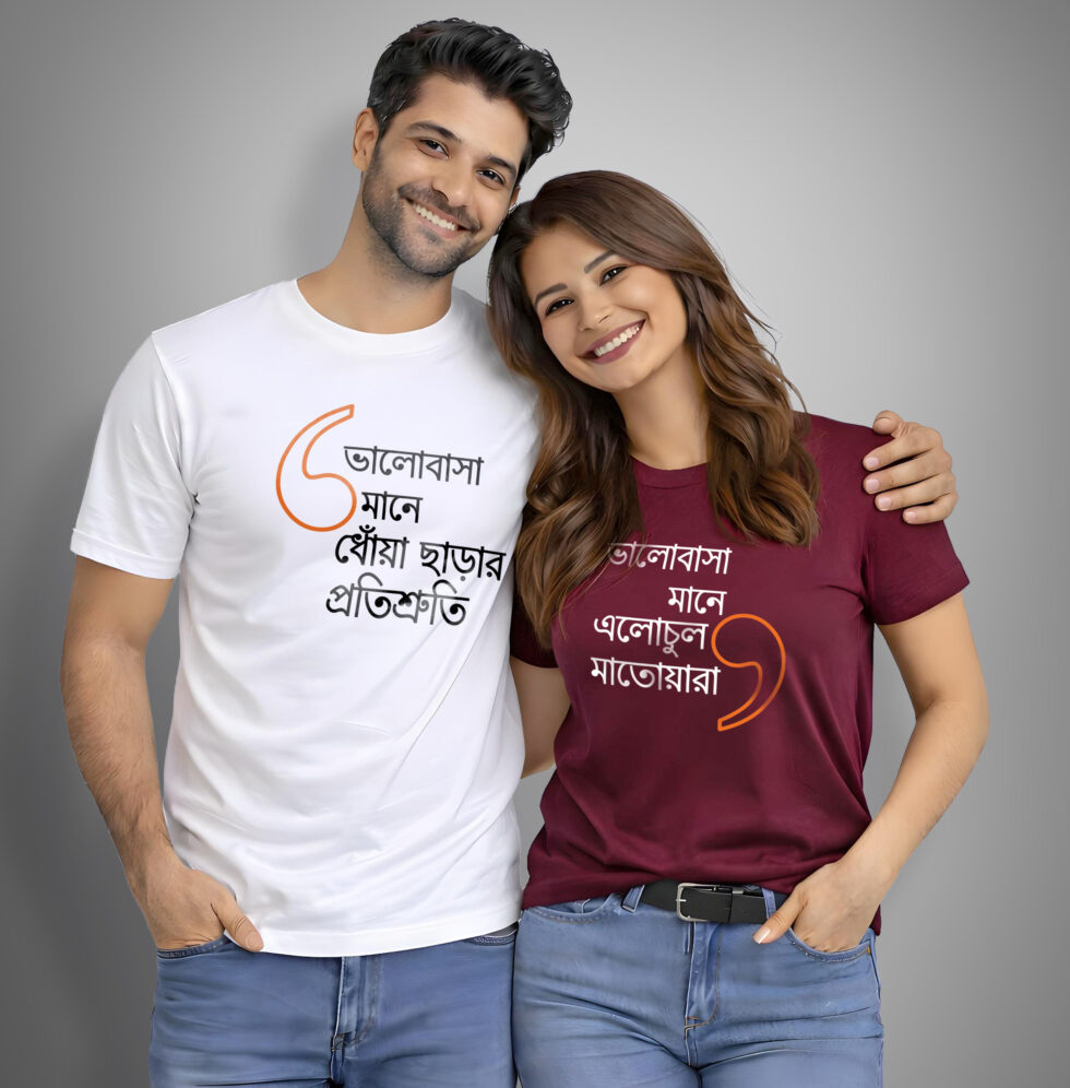 “Bhalobasa mane dhowa chharar protishruti” is for the responsible promises, the adjustments, the acha thik ache moments. “Bhalobasa mane elo chul matoara” is for the chaos, the laughter, the small joys that make everything feel lighter. Wear them together and suddenly it’s obvious.