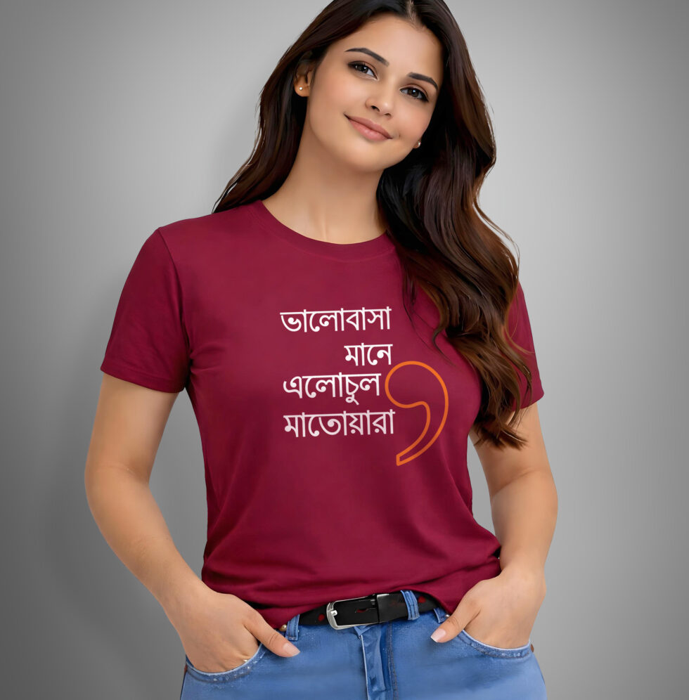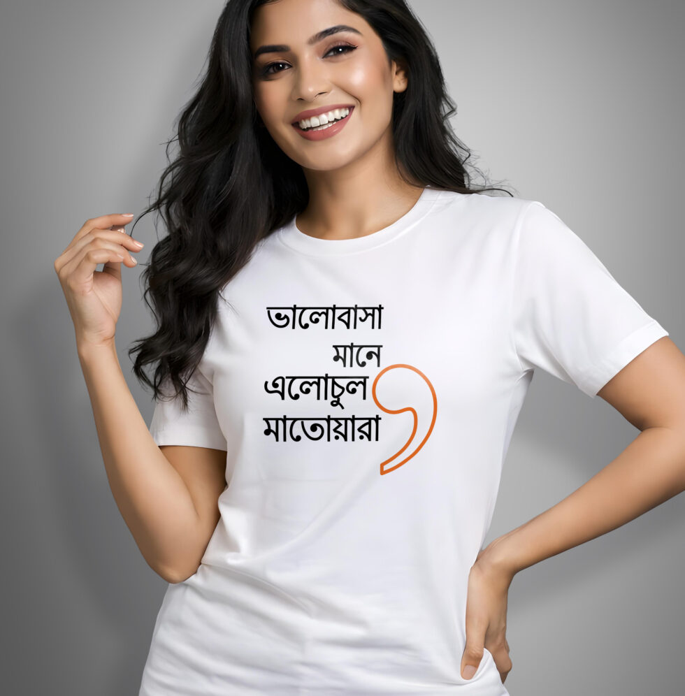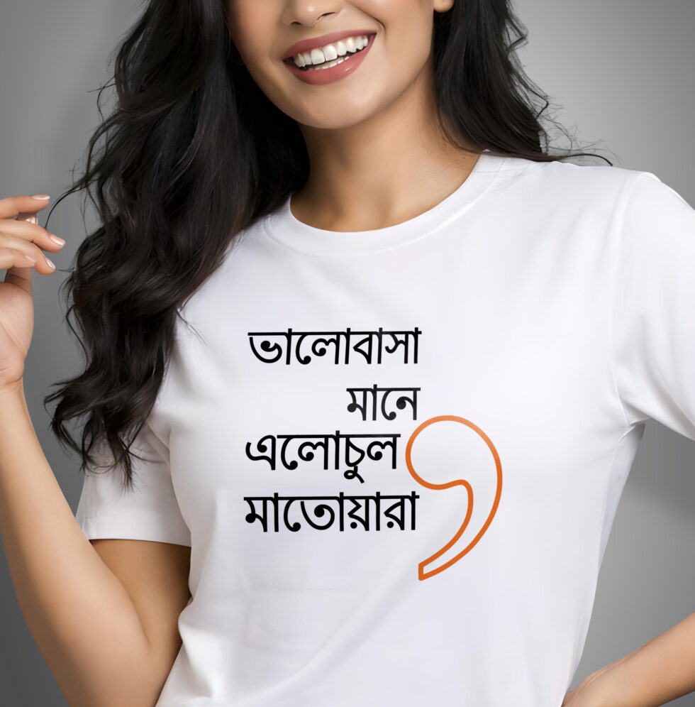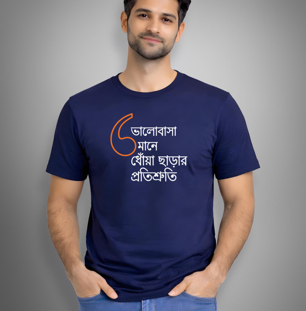 “Bhalobasa mane dhowa chharar protishruti” is for the responsible promises, the adjustments, the acha thik ache moments. “Bhalobasa mane elo chul matoara” is for the chaos, the laughter, the small joys that make everything feel lighter. Wear them together and suddenly it’s obvious.