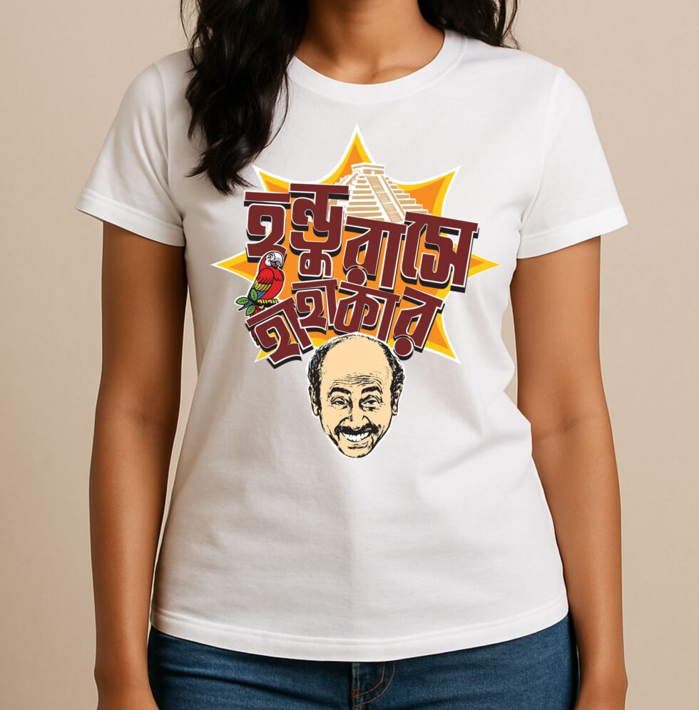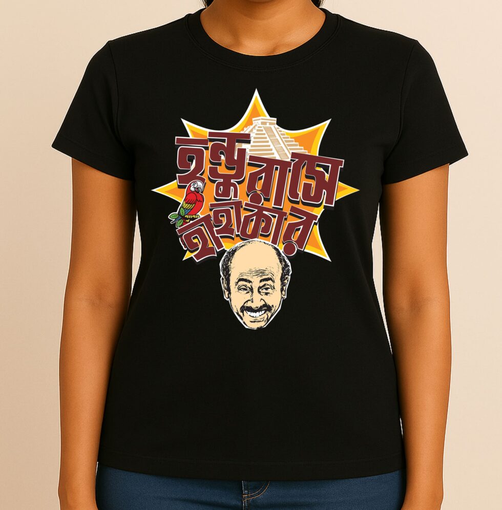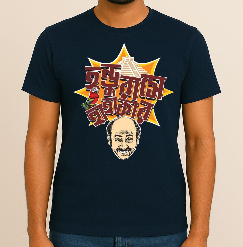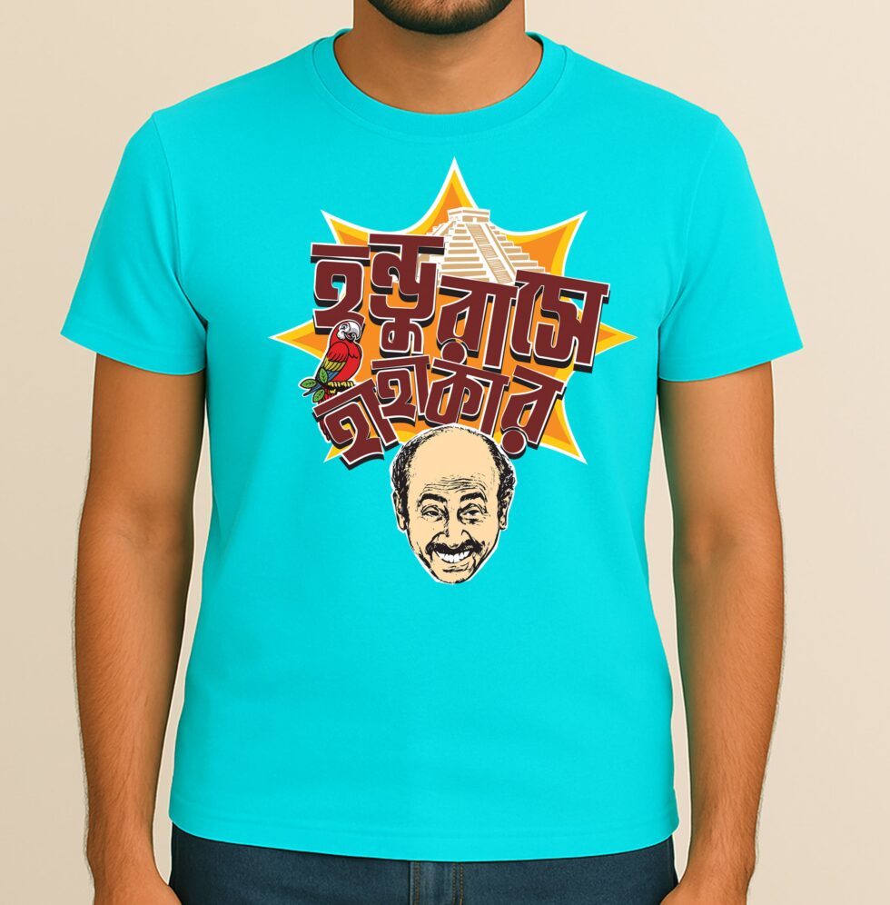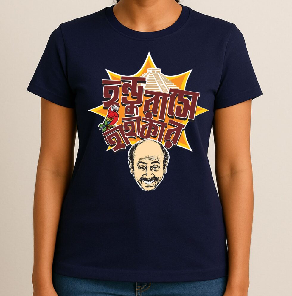 A Prakhar Rudra masterpiece. Honduras-e Hahakar, one of Jatayu’s most hilariously titled adventures, is a glimpse into his delightful imagination. Now, that imagination lives on — on fabric! Get this uniquely designed T-Shirt and pay your tribute to Ray and the evergreen Lal Mohan Ganguly.