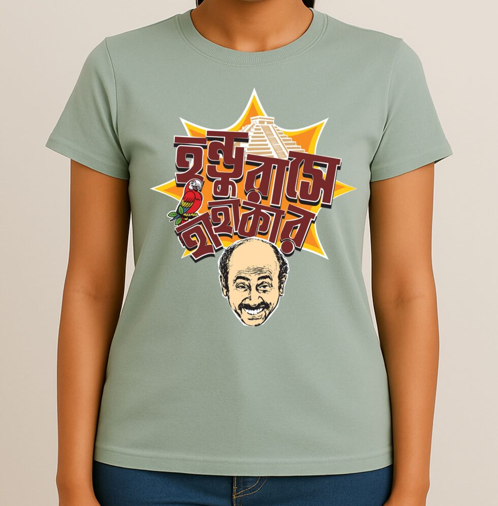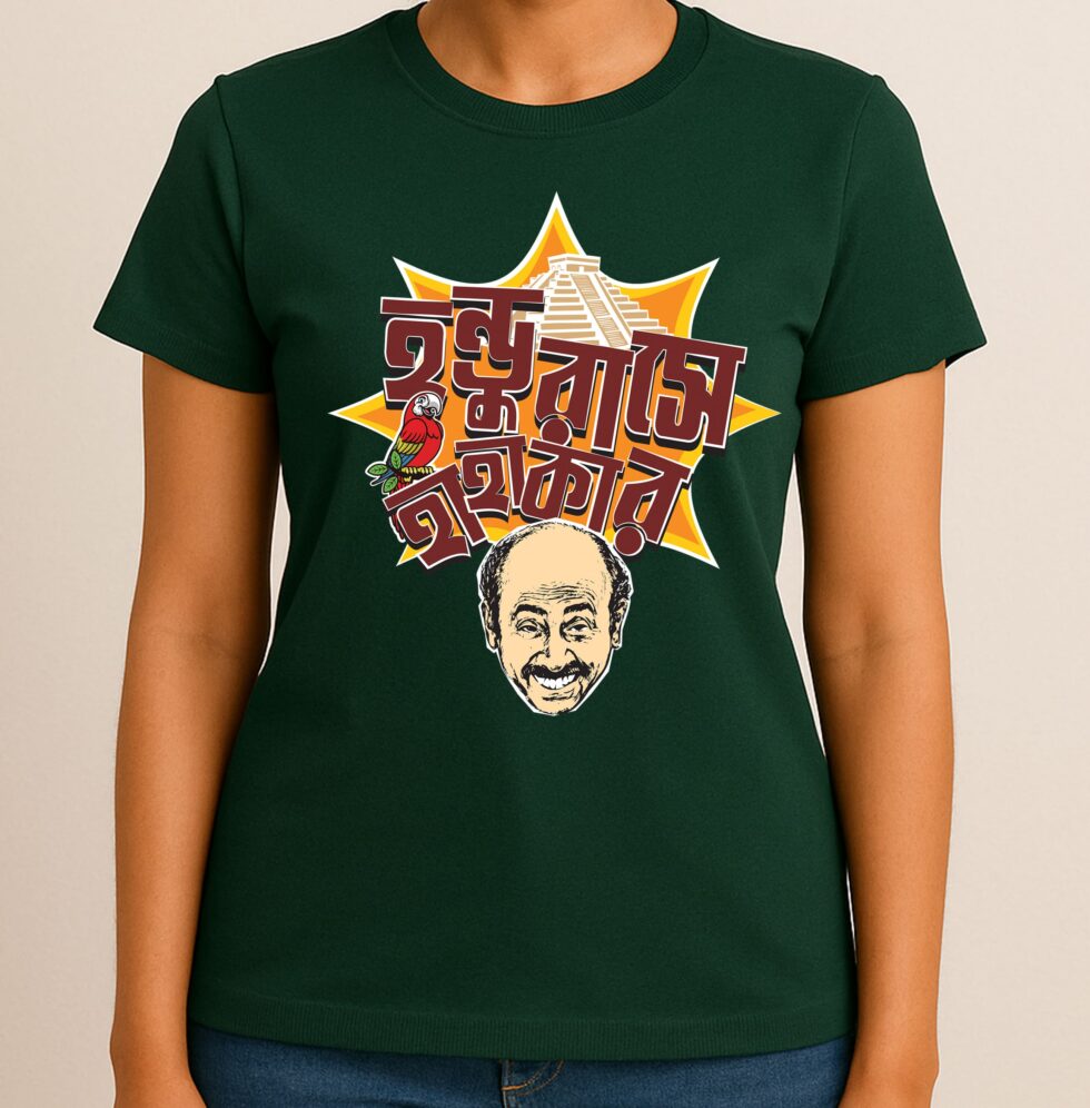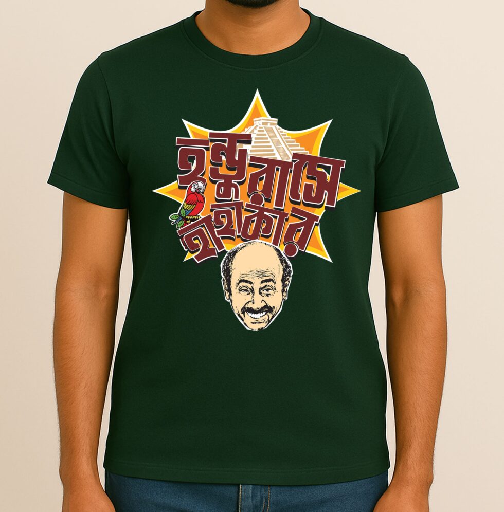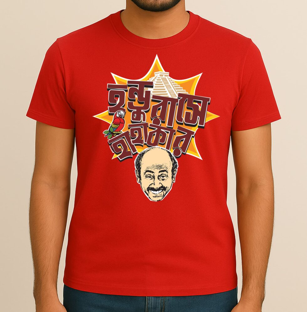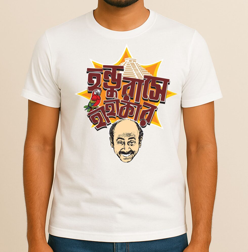 A Prakhar Rudra masterpiece. Honduras-e Hahakar, one of Jatayu’s most hilariously titled adventures, is a glimpse into his delightful imagination. Now, that imagination lives on — on fabric! Get this uniquely designed T-Shirt and pay your tribute to Ray and the evergreen Lal Mohan Ganguly.