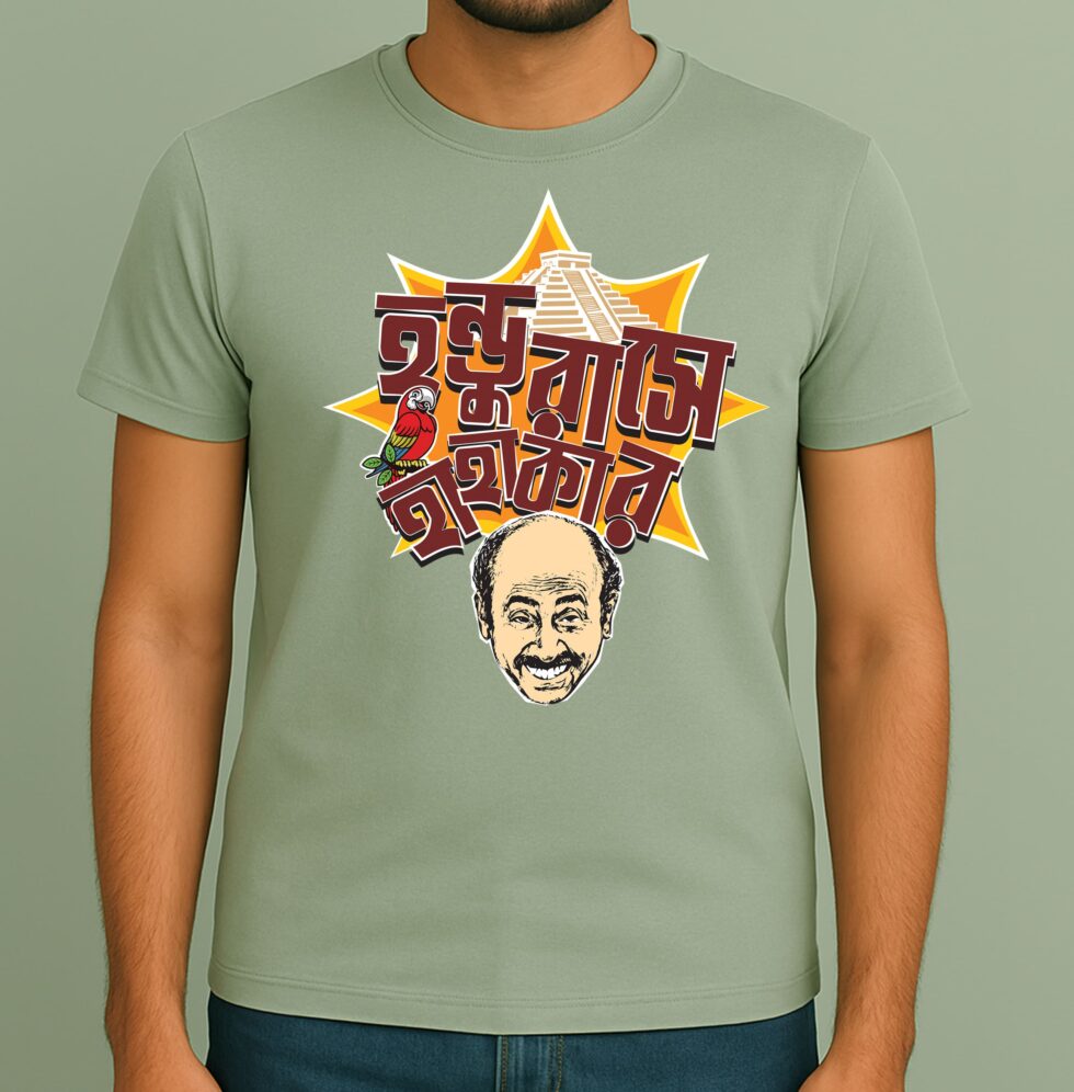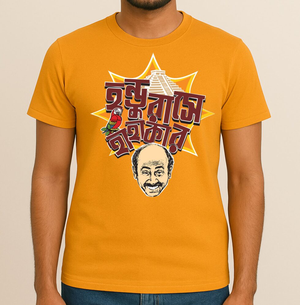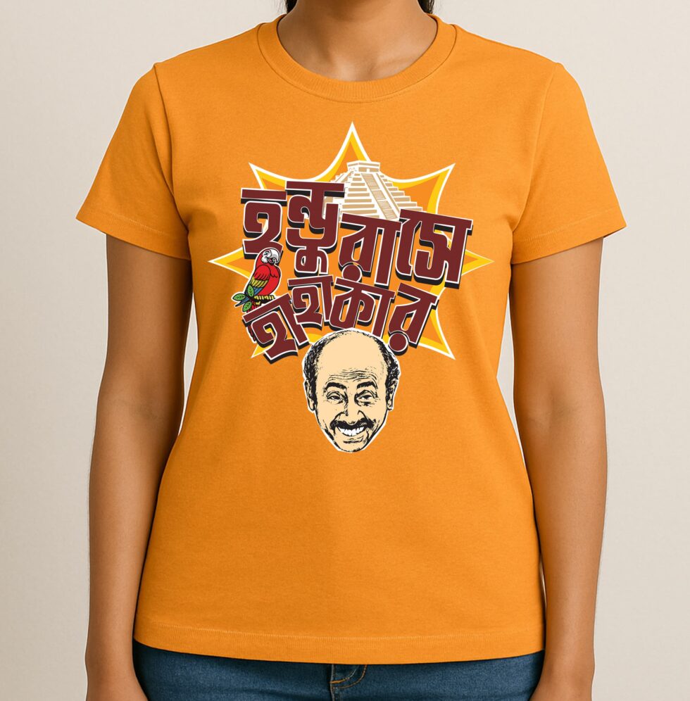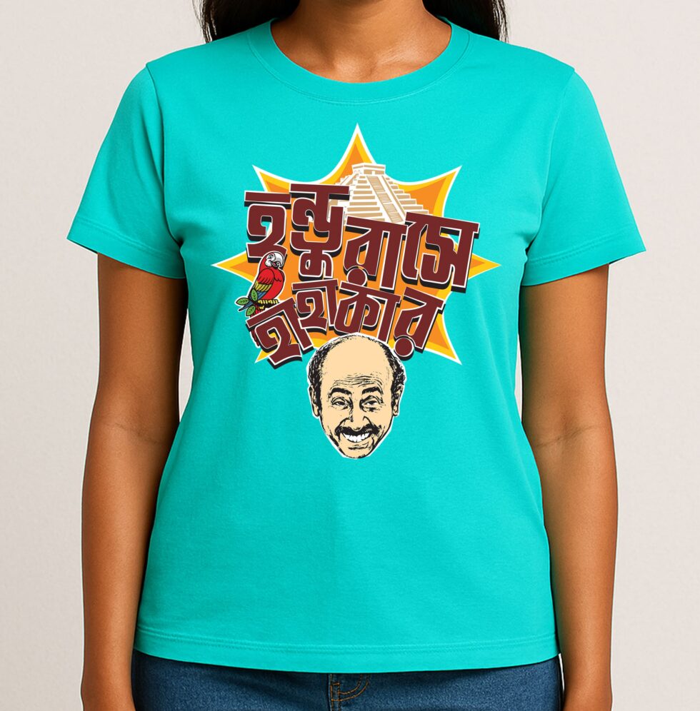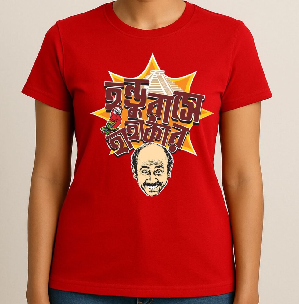 A Prakhar Rudra masterpiece. Honduras-e Hahakar, one of Jatayu’s most hilariously titled adventures, is a glimpse into his delightful imagination. Now, that imagination lives on — on fabric! Get this uniquely designed T-Shirt and pay your tribute to Ray and the evergreen Lal Mohan Ganguly.